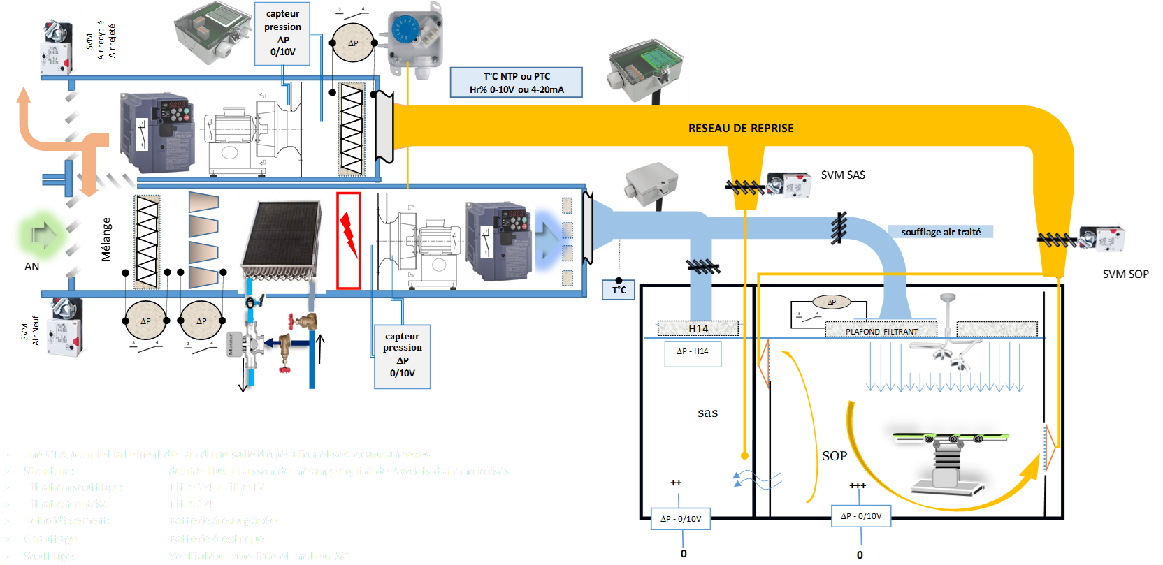La gestion d’une CTA double flux pour traiter l’air dans une salle d’opération et un sas. pour des raisons pédagogiques, nous avons limiter l’étendue de l’installation.